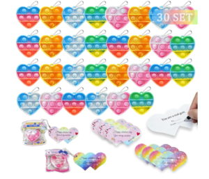 This ready-to-use set works well for classroom Valentine exchanges, party favors, prize bins, or small non-candy gifts. The pop-it hearts double as a fun sensory fidget and a keepsake kids can clip to backpacks, pencil cases, or keyrings.